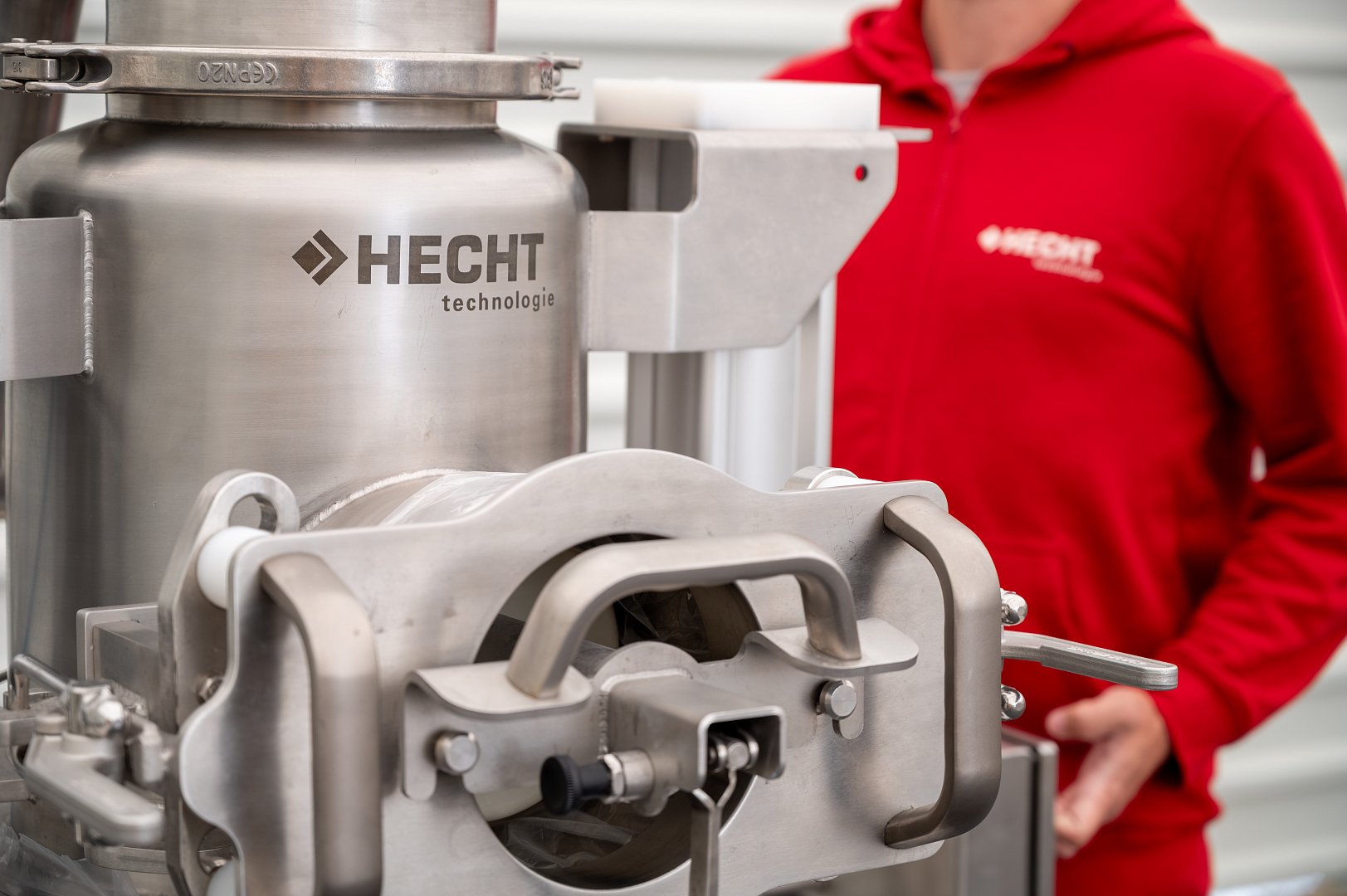 - Nach dem Entleeren wird der Sekundärliner mit dem HECHT Containment Verschluss-System zweimal abgebunden und abgetrennt